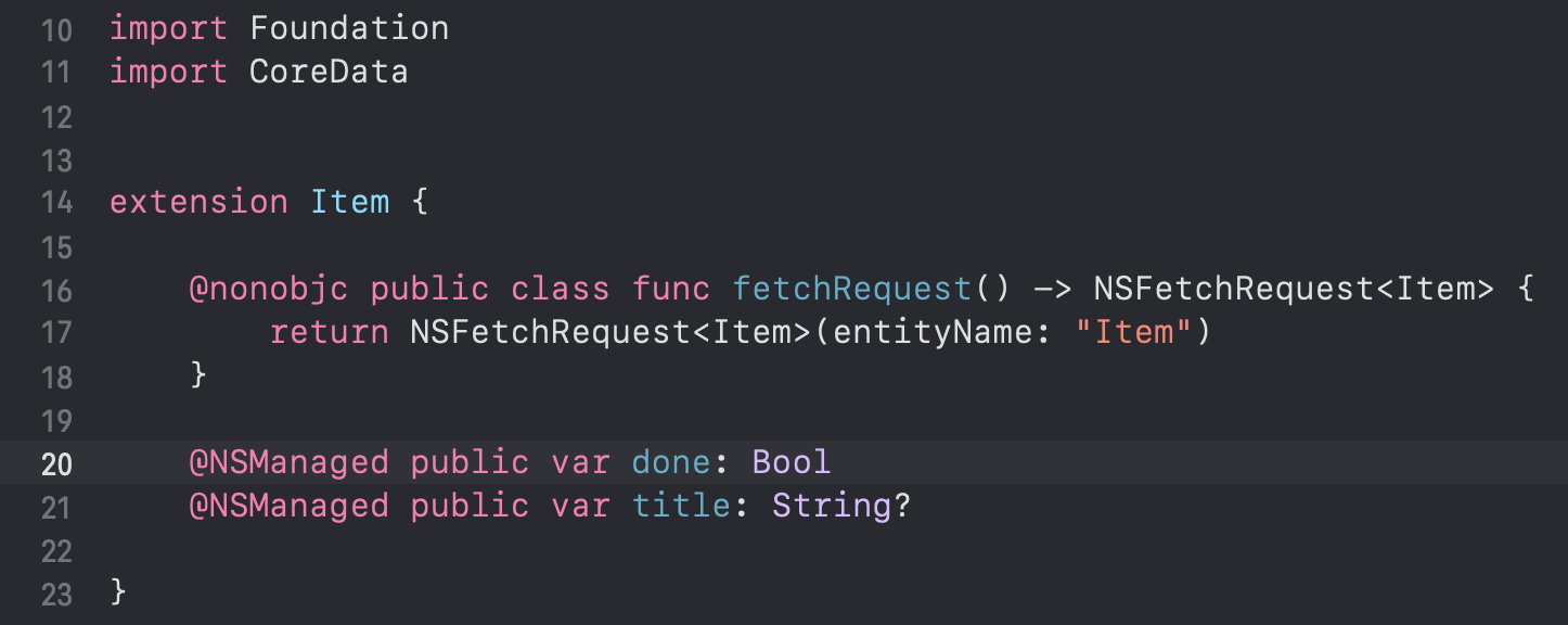 기본값은 Class Definition이다 우리가 만든 엔티티와 속성을 클래스와 프로퍼티를 만든 것처럼 사용할 수 있도록 해준다. 클래스가 생성되지만, Xcode상의 파인 터에는 생성되지 않고, 특정 위치에 생성된다. 실제로 생성된 클래스의 모습이다.