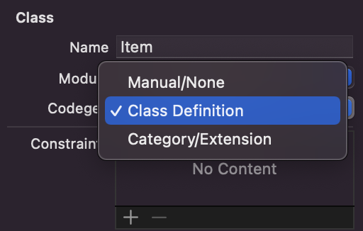 또한 엔티티의 속성에서 Codegen이라는 속성을 볼 수 있다. Manual/None, Class Definition, Category/Extension 세 가지의 옵션이 있다.